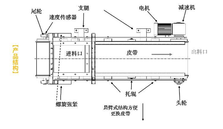 7)下料斗:完成從料倉向皮帶上均勻供料,調(diào)節(jié)閘門開度,可改變皮帶上料層厚度;